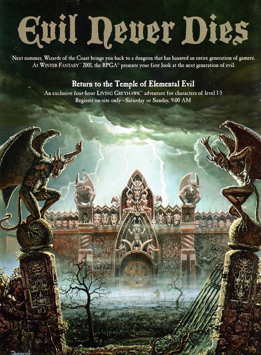 With the publication of D&D 3e (2000), Wizards decided to take a new tack with Greyhawk. They turned it into the default campaign world for D&D. This meant that it appeared slightly in the core rules, for example offering up a core list of deities. More importantly, it also became the setting for the RPGA's "living" setting, where players across the world could take part in both core modules and regional events, carrying their character from one game to another. Living Greyhawk (2000-2008) thus beecame the center of RPGA play. It premiered at the 2000 Gen Con Game Fair with events such as "Dragonscales at Morningtide", "The Reckoning", and the controversial "core" adventure "River of Blood". Winter Fantasy 2001 then continued the fun with "Return to the Temple of Elemental Evil". Living Greyhawk built on the success of the Living City (1987-2003) and would ultimately surpass it, with Living Greyhawk seeing ten times as much play as Raven's Bluff by 2002.