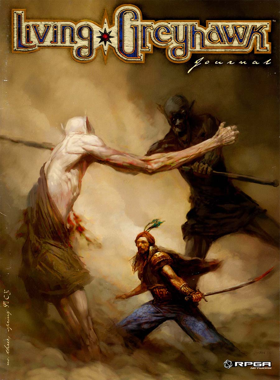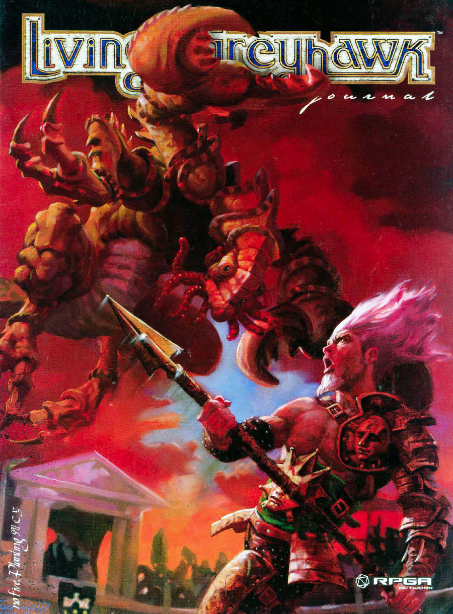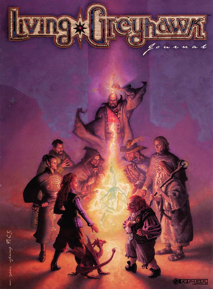 Though the RPGA had their own magazine, Polyhedron (1981-2002), they decided to start up a new periodical for Living Greyhawk, the Living Greyhawk Journal (2000-2002), available to all "guild level" members. It premiered with a short and flimsy Living Greyhawk Journal #0 (August 2000), which was given away with Dragon #274 (August 2000) and likely at the 2000 Gen Con Game Fair as well. Issues #1-4 then followed as subscription items for guild-level RPGAers. Each ran 32 pages and included "Campaign News" about the RPGA, "Dispatches" of setting news, a new set of Greyhawk monsters from Sean K Reynolds, and other original articles about Greyhawk from luminaries such as Gary Holian, Fred Weining, and editor Erik Mona.