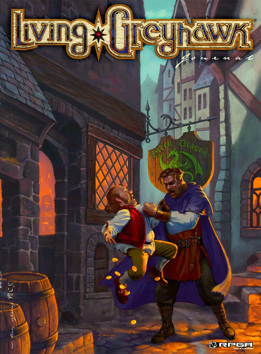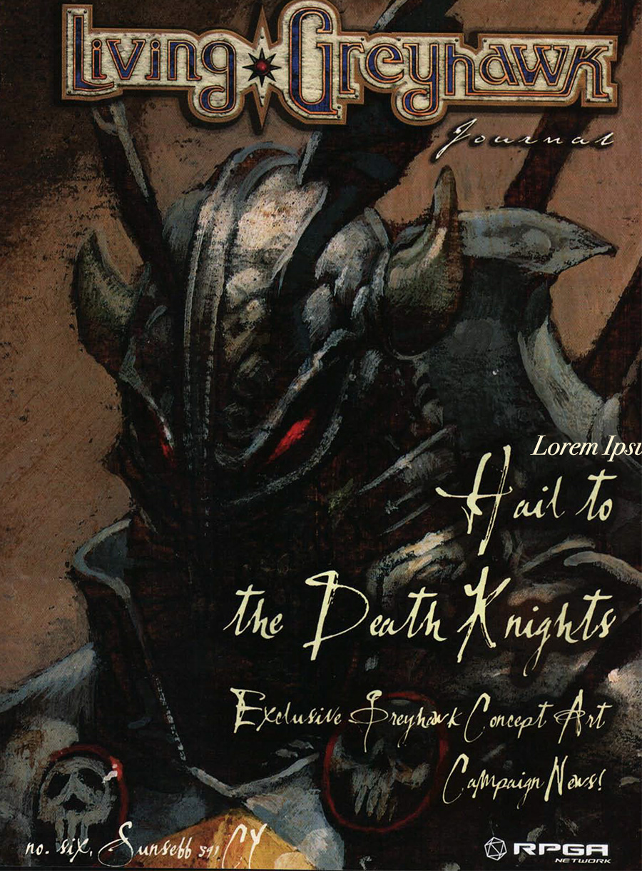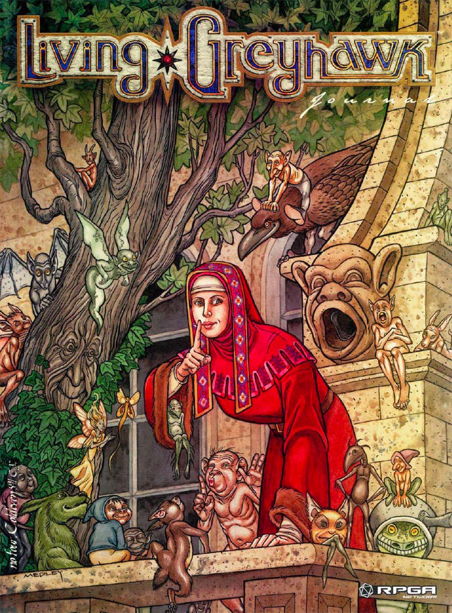 Though the RPGA had their own magazine, Polyhedron (1981-2002), they decided to start up a new periodical for Living Greyhawk, the Living Greyhawk Journal (2000-2002), available to all "guild level" members. It premiered with a short and flimsy Living Greyhawk Journal #0 (August 2000), which was given away with Dragon #274 (August 2000) and likely at the 2000 Gen Con Game Fair as well. Issues #1-4 then followed as subscription items for guild-level RPGAers. Each ran 32 pages and included "Campaign News" about the RPGA, "Dispatches" of setting news, a new set of Greyhawk monsters from Sean K Reynolds, and other original articles about Greyhawk from luminaries such as Gary Holian, Fred Weining, and editor Erik Mona.