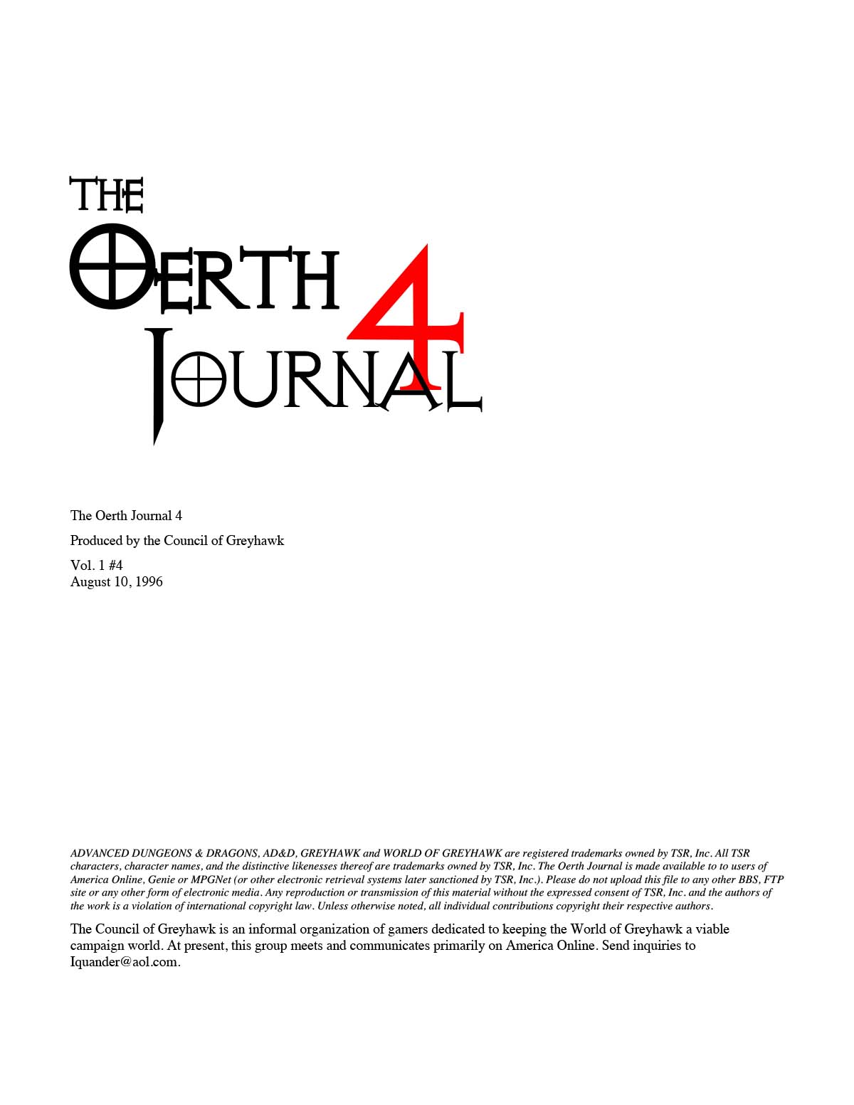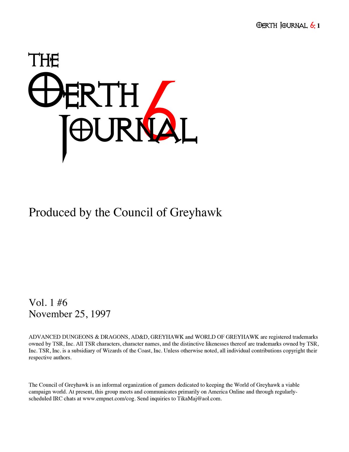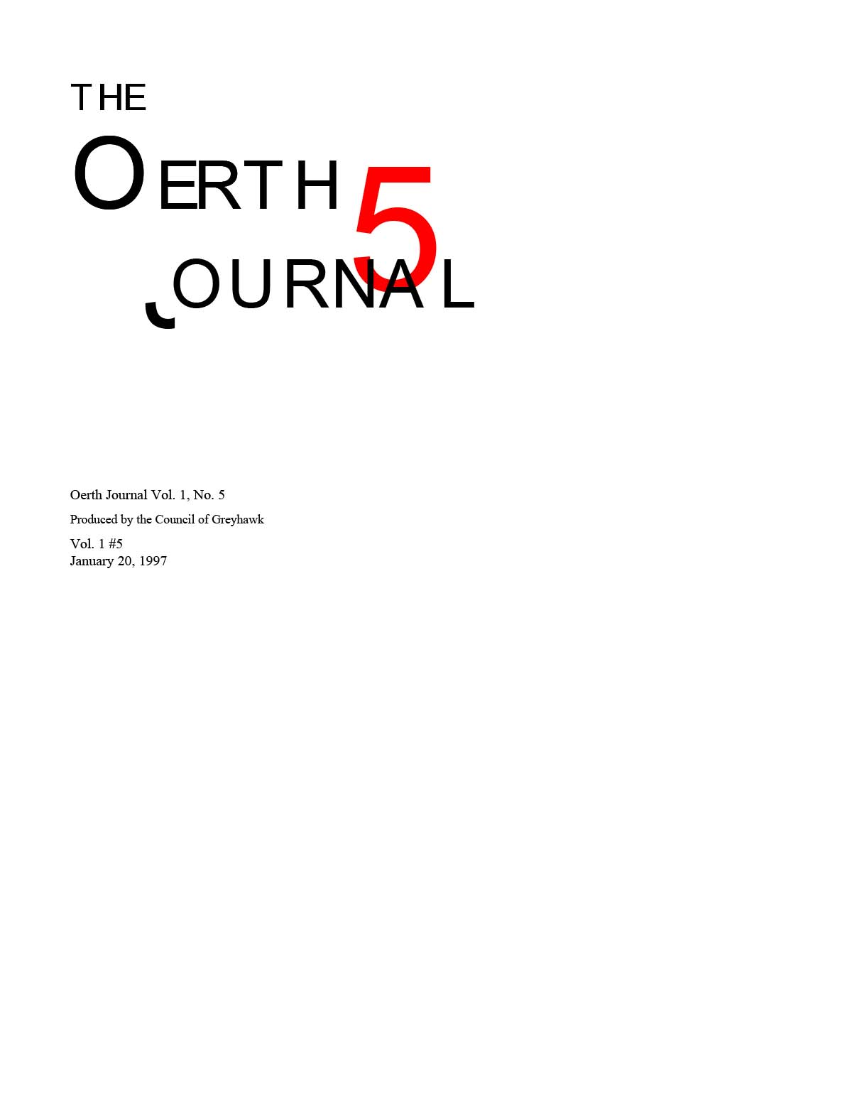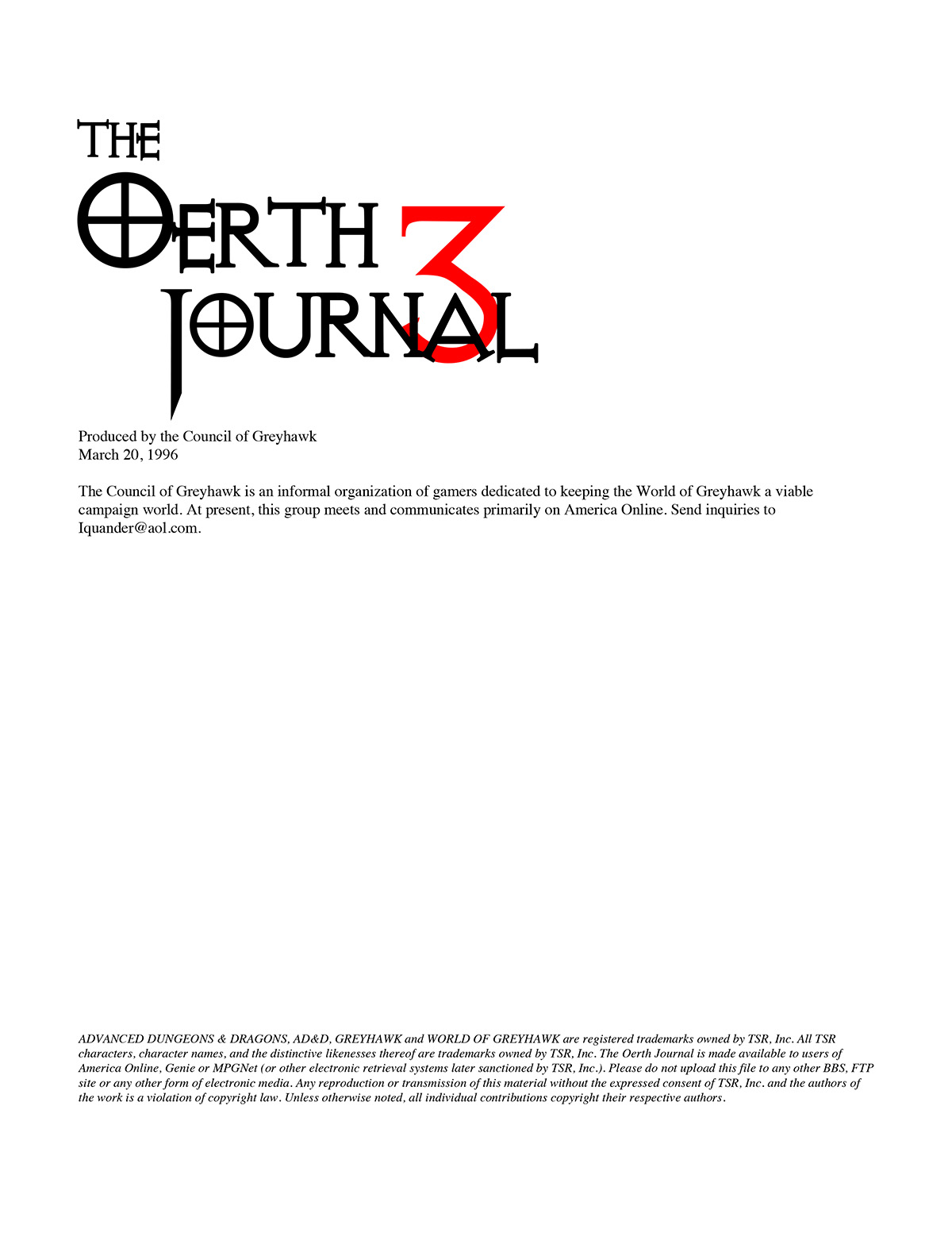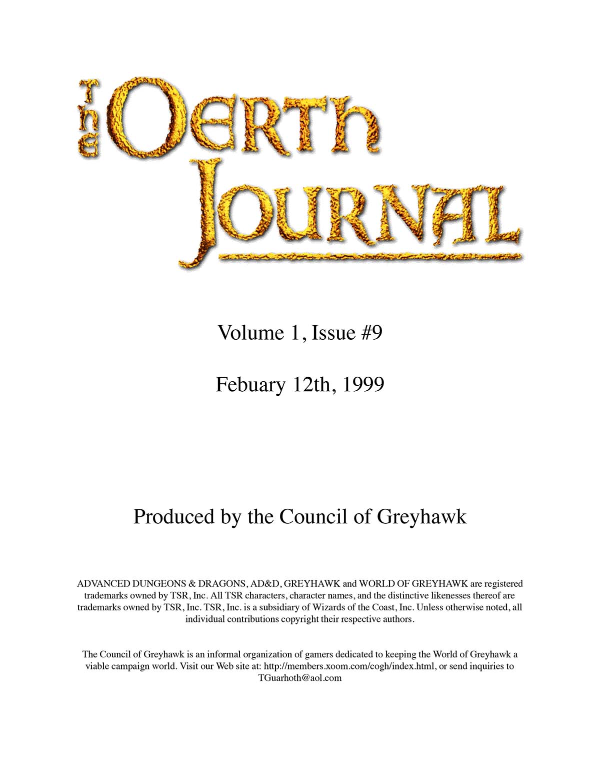 In March 1995, shortly after the Council of Greyhawk's foundation, they announced that they would be publishing a free e-magazine called the Oerth Journal to the TSR section of AOL. The Oerth Journal #1 (May 1995) followed a short time later, the first of eleven zines produced by the Council, concluding with The Oerth Journal #11 (May 2000), all focused on the Greyhawk Wars period of Oerth history using the AD&D 2e (1989) rules.