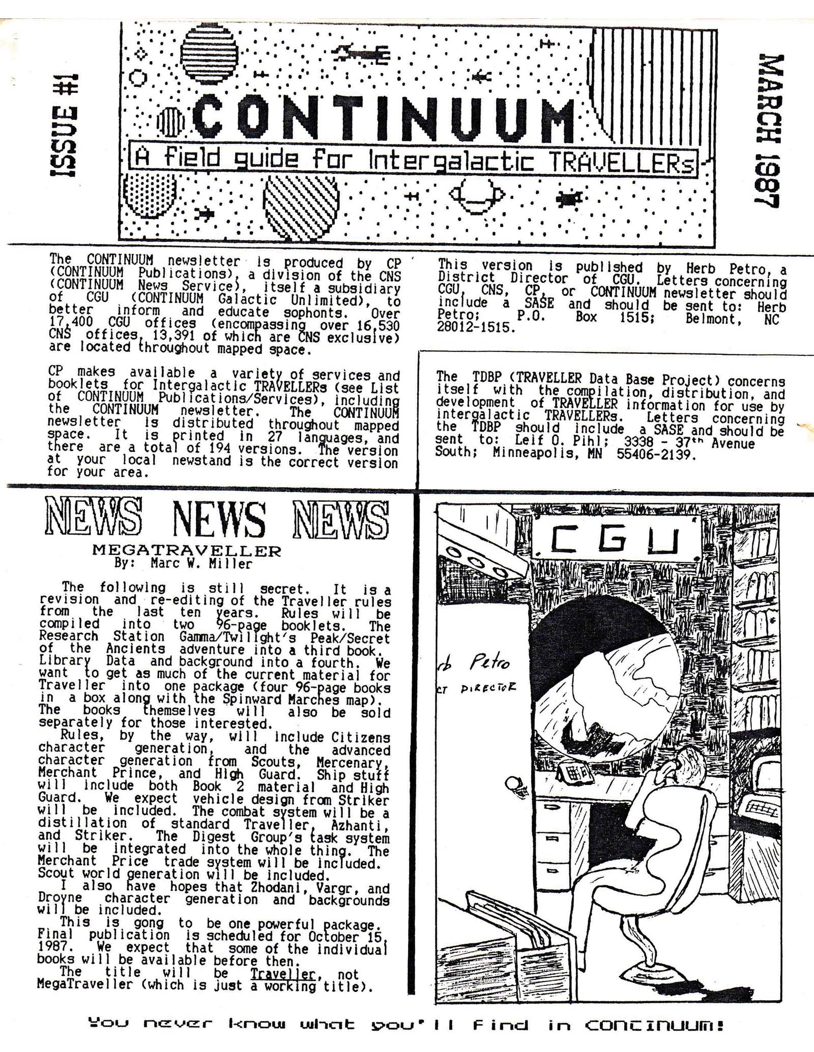 When Herb Petro brought his work in The Imperium Staple (1986-1987) to an end with issue #10 (January 1987), it was because he no longer had enough time for the publication. But he wasn't done with publishing amateur Traveller material. Just a month later he produced "HPCGS", or the Herb Petro Character Generation System, a 12-page digest describing a point system for Traveller character generation, based in part on articles that he'd run in earlier issues of The Imperium Staple. Then he started a whole new magazine with Continuum #1 (March 1987).