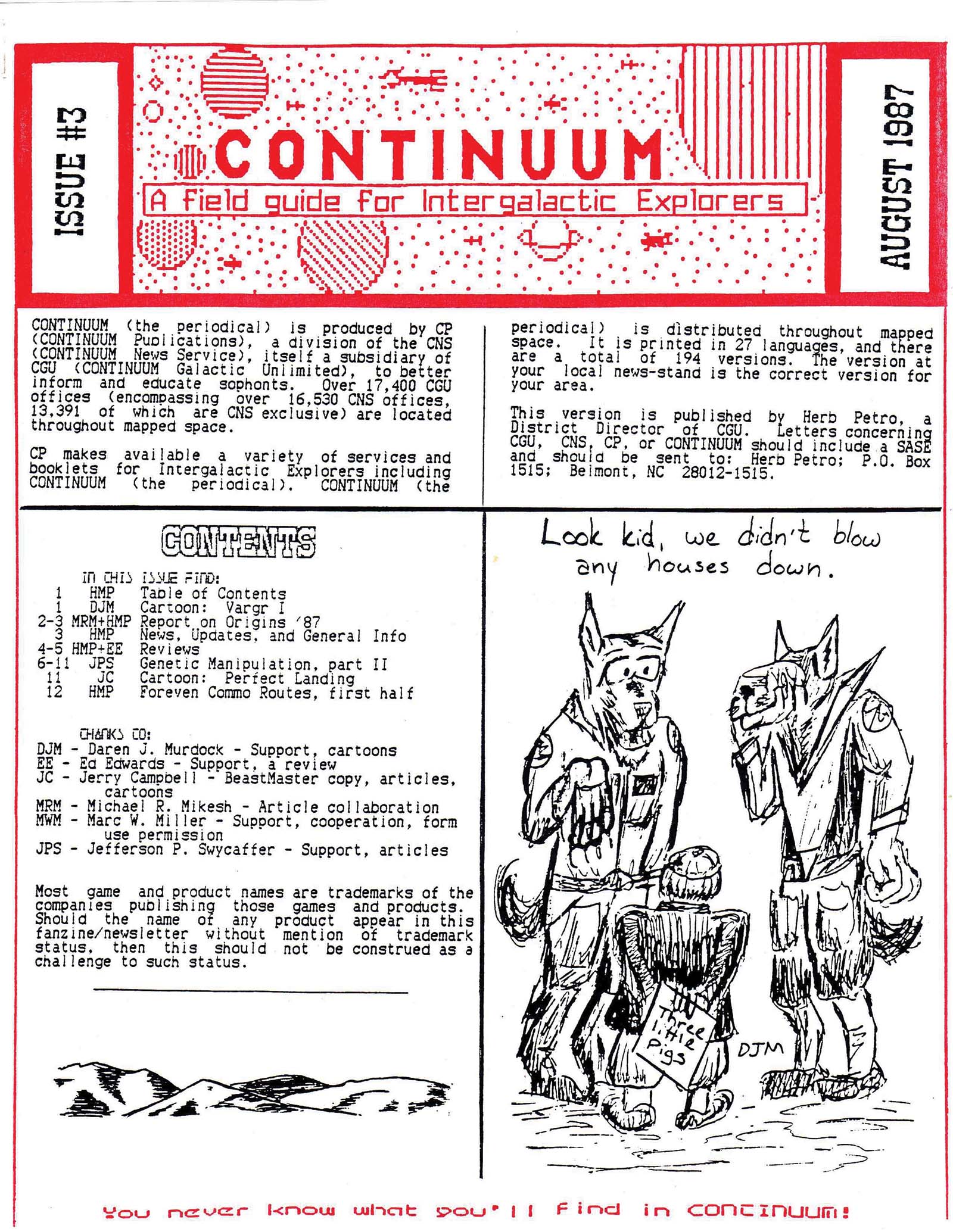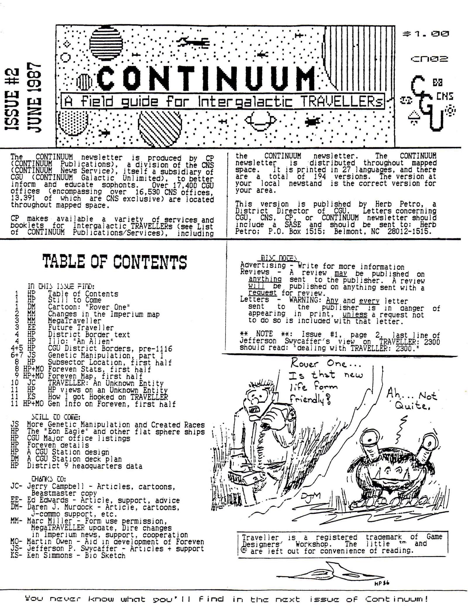 However, Petro also wanted to content of Continuum to vary from other 'zines out there. He said:: "CONTINUUM was founded to contain discussions, letters, non-standard articles, and any other misc. little tidbits, articles, news, and other material that is not accepted or appropriate elsewhere (not necessarily all for TRAVELLER)." His desire for speculation and discussions was particularly interesting because it foreshadowed the type of content that would soon be generated by the History of the Imperium Working Group (HIWG), which would be co-founded by Petro's regular co-conspirator, Ed Edwards, later the same year!