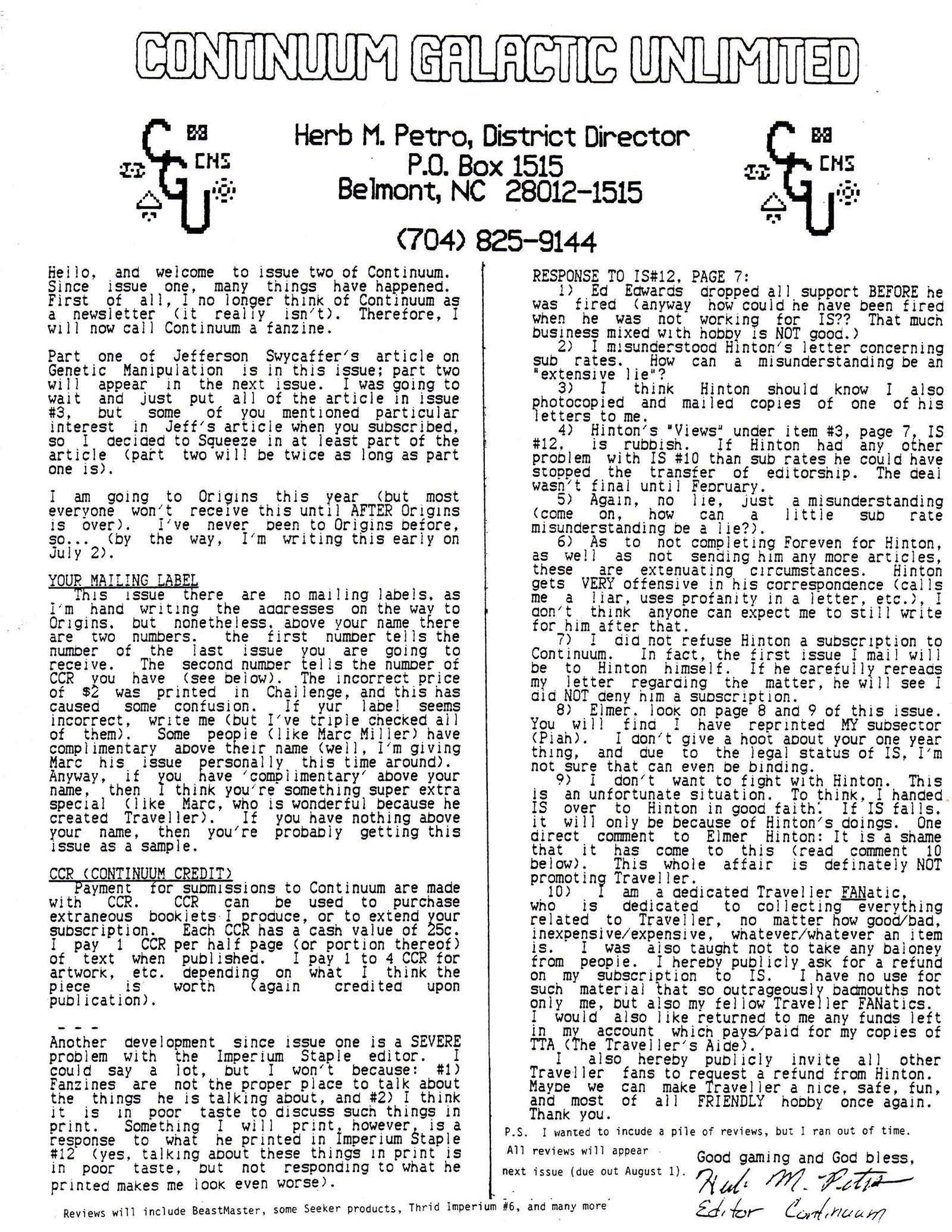 Unfortunately, Herb Petro and Continuum found themselves caught up in a nasty fight with another Traveller fan, Elmer Hinton, who Petro had picked to take over The Imperium Staple after his departure. Hinton's first issue of Petro's former periodical, The Imperium Staple #11 (April 1987), slammed the debut of Continuum: Hinton was angry at Petro's request for SASEs (incorrectly saying that no "legitimate magazine" required them), angry at Petro not categorizing Hinton's own Traveller's Aide PBeM newsletter as a Traveller zine (though this historian agrees), and generally offered rude criticism of Continuum. The Imperium Staple #12 (June 1987) revealed that Hinton had deeper grievances with Petro, which may well have been a factor in the unfriendly review.