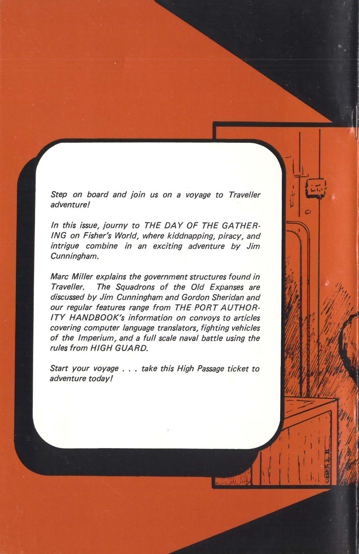High Passage magazine was created by the High Passage Group of Jim Cunningham, Craig Johnson, and Scott Walschlager, who were high-school friends that were fans of Traveller; they turned a graphic-art class project into a professional magazine courtesy of a license from Marc Miller. The result was Traveller's second professional magazine, following GDW's own Journal of the Traveller's Aid Society (1979-1985). It was very nearly Traveller's second periodical of any type, but the British fanzine Alien Star 1981-1982), also produced by high school students, preceded the April or May debut of High Passage by a few months.